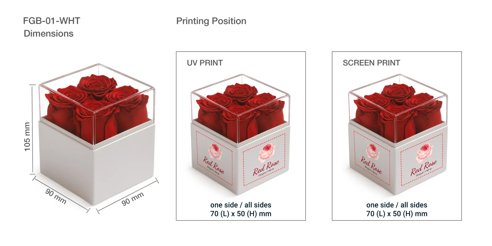 The Forever Roses are carefully preserved to retain their natural beauty, ensuring they look fresh and vibrant for up to 1 to 3 years. Customize the box with a personal message, logo, or design using our screen printing or full-color UV printing options to make the gift even more unique.