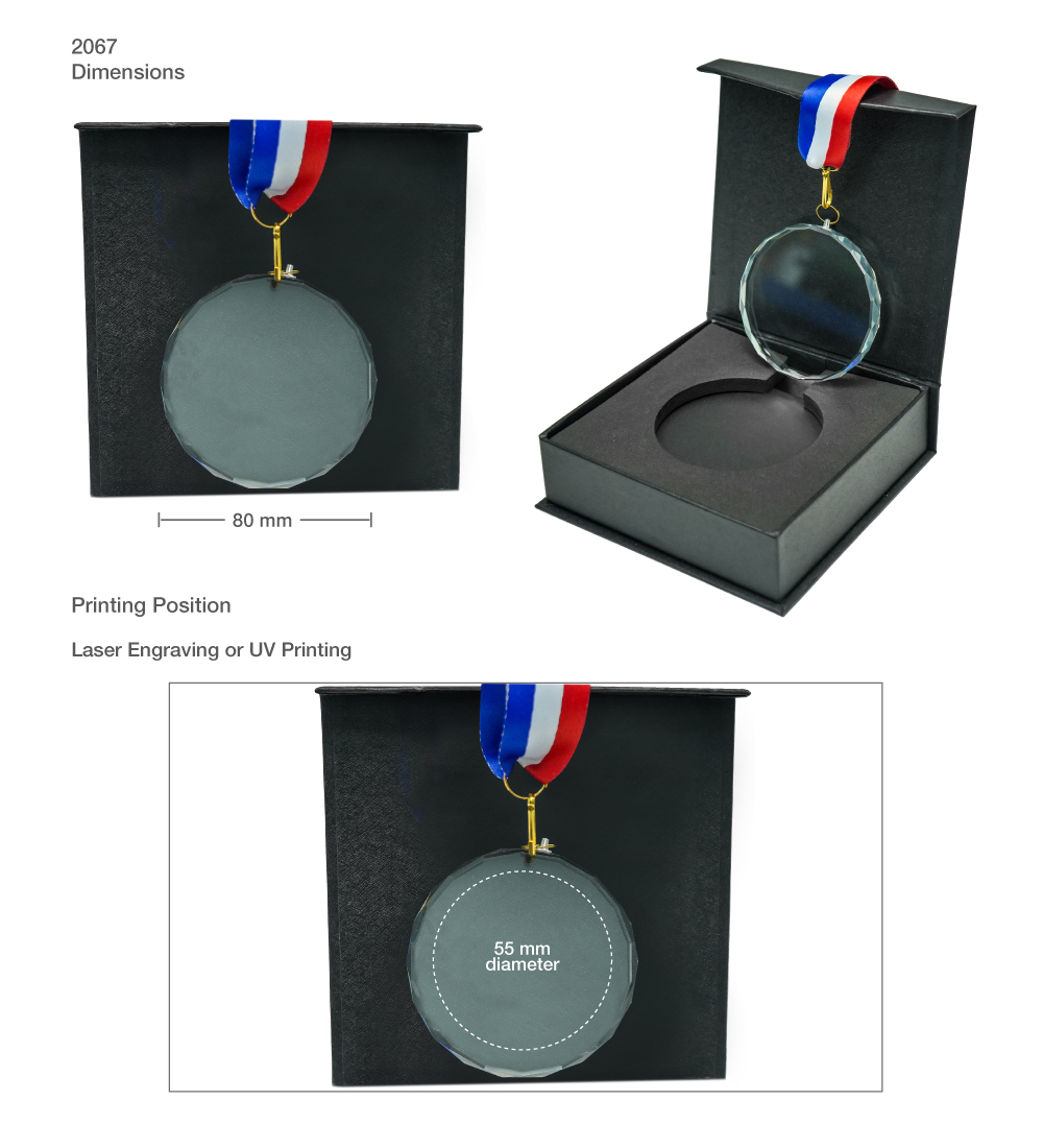 A high-quality 8 cm glass medal, customizable with UV printing or laser engraving, supplied with a branded ribbon and a presentation box.