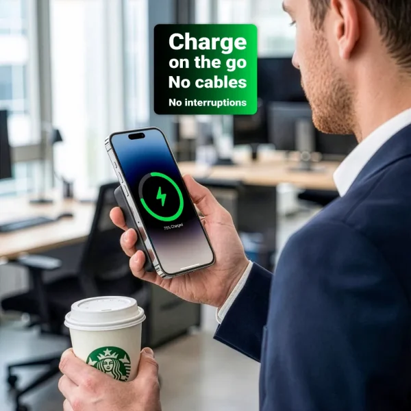 MagSafe-compatible wireless powerbank with 15W fast charging, magnetic wireless function, and illuminated logo branding. A compact and powerful promotional tech accessory packed in a premium magnetic closure gift box.