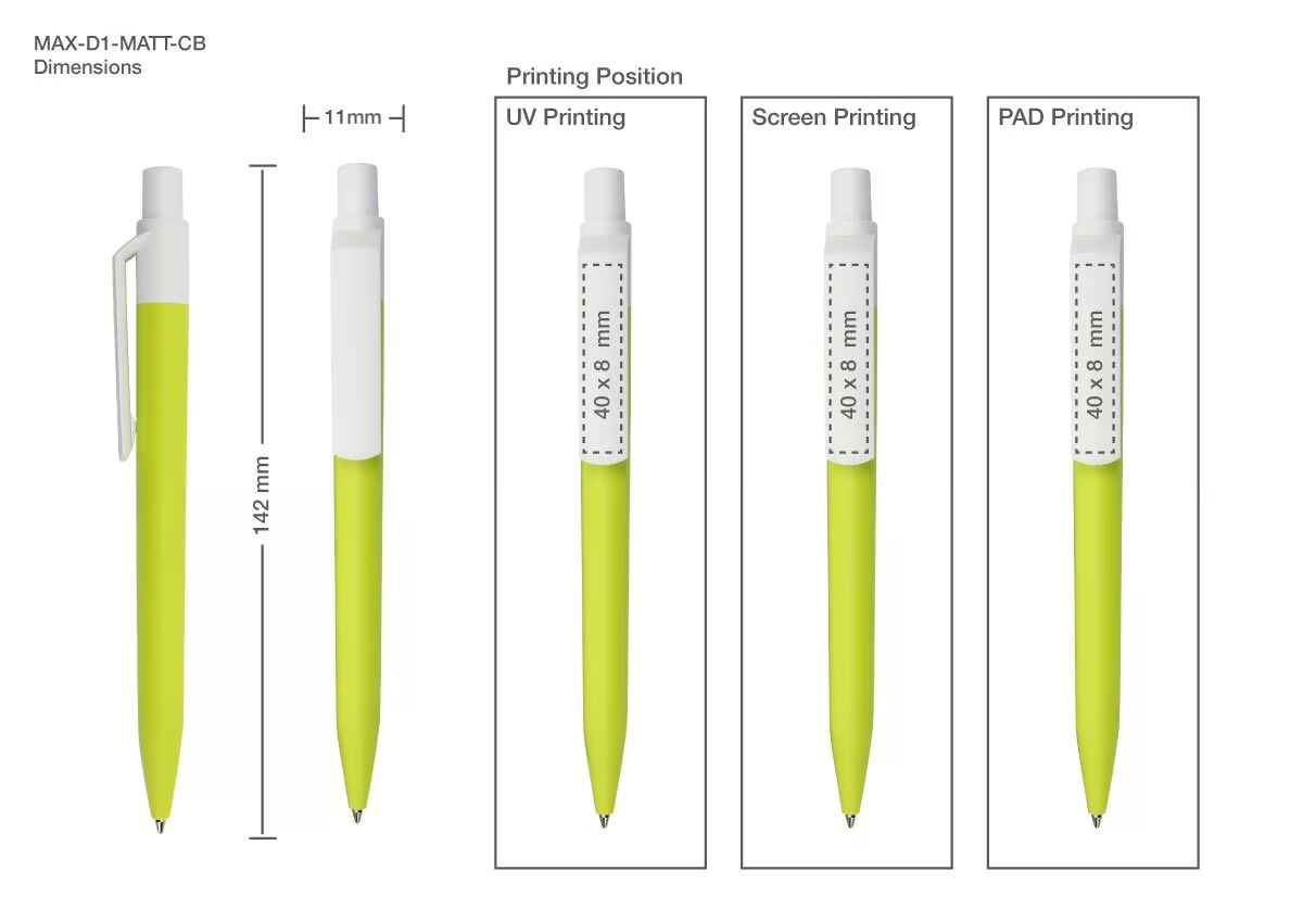 White-clipped Maxema MATT pens are well-known small company giveaways. They used durable plastic to create their creations. They are strong and secure to utilize as a result. Its barrel has been expertly made and solid-colored rubberized. Because of this, the entire barrel has a matte rubbery texture. This Maxema Matt pen has such a chic style. The color of the barrel and tip match. The clip, however, is white and has a shiny appearance. Options for screen printing and UV printing are included. As a result, you can have these pens personalized as custom-printed pens for your business. The push-button of the pen is silver-plated as well. As a result, it makes the pen appear expensive.