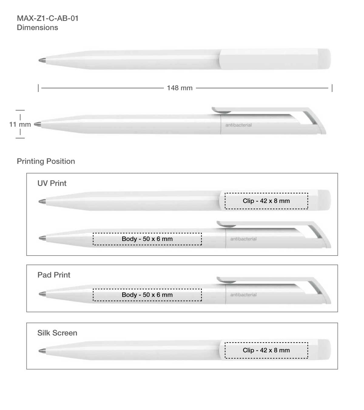 Maxema Zink antibacterial pens are personalized pens. They are crafted with non-toxic and recyclable ABS plastic material. So, this ABS material is highly resistant. Thus, it makes the product antibacterial. Hence, it’s safe for use. It comes in a solid white color metallic barrel. Thus, it gives a shiny metallic look. This pen comes with twist action technology. So, the nib switches when you move the stylish clip. It comprises X20 ink. The ink is available in black and blue colors.