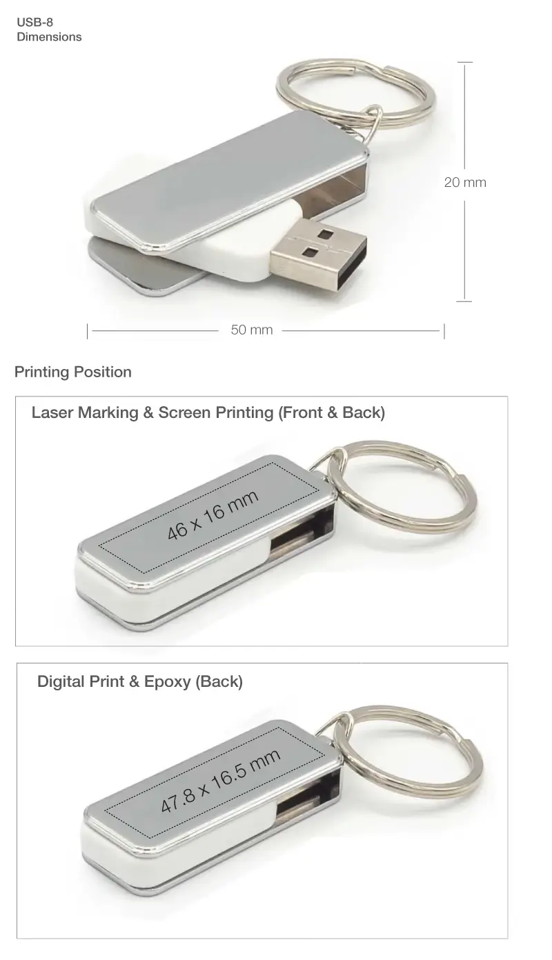 USB with Key Holder the graceful silvery layout. So we have presented a stylish Swivel USB drive with a key holder that can be used as a keychain. It is a perfect promotional gift to be given out at special events, marketing advertisements, & launching incidents. In addition, laser marking, digital printing with epoxy, and screen printing are all used to print up your company’s and brand’s logos to make them pop out in the technology world. So this Promo USB with printing is ideal as a promotional gift for company promotions, or special events.