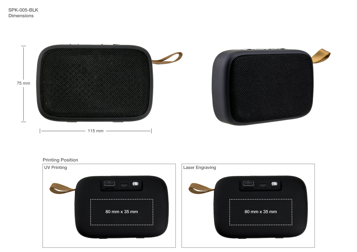 - ABS Material with fabric grill speaker and bottom has rubber strip grip.