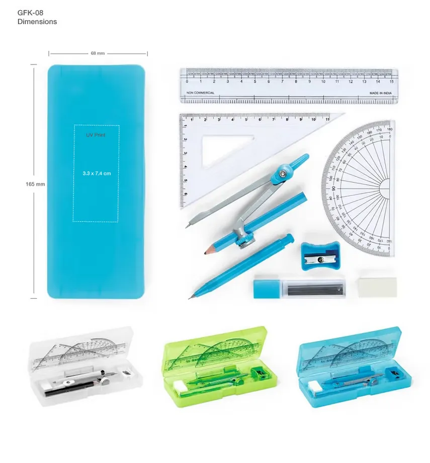 The promotional geometry set will help you to draw any shape. It will help you to measure things correctly. You can also use it as a gift. Gift it to school students and make their work easy. You can also use it as a corporate gift. You can customize your company logo on it because of its UV and screen printing options. Gift it to others to promote your business.