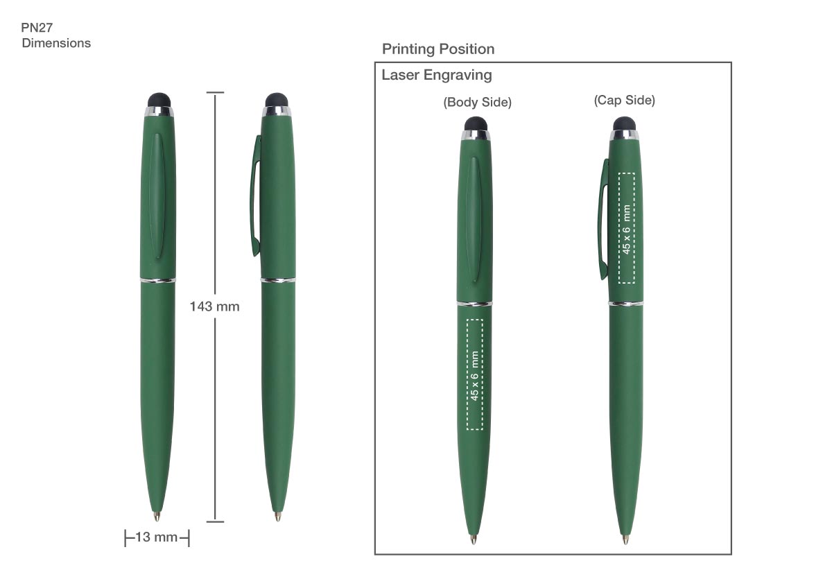 Moreover, it’s a 2-in-1 pen. So, it comprises a ball pen and a stylus. The stylus is present at the top of the pen. It is in black. Thus, you can use it on your smartphone. Apart from the barrel, it also comprises a clip. The clip is the same color as the barrel. Thus, it’s a perfect personalized pen with a stylus.  Thus, you can also use this personalized pen with a stylus for events.