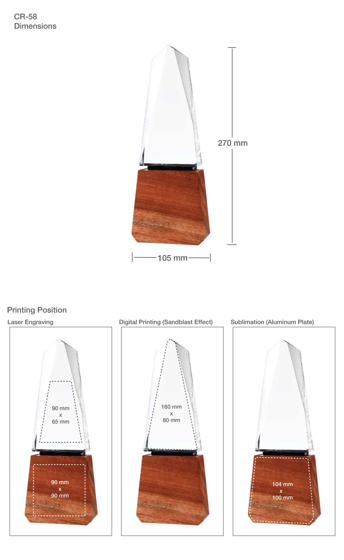 Tower-shaped crystal awards with wood base and packed in a wooden presentation box.