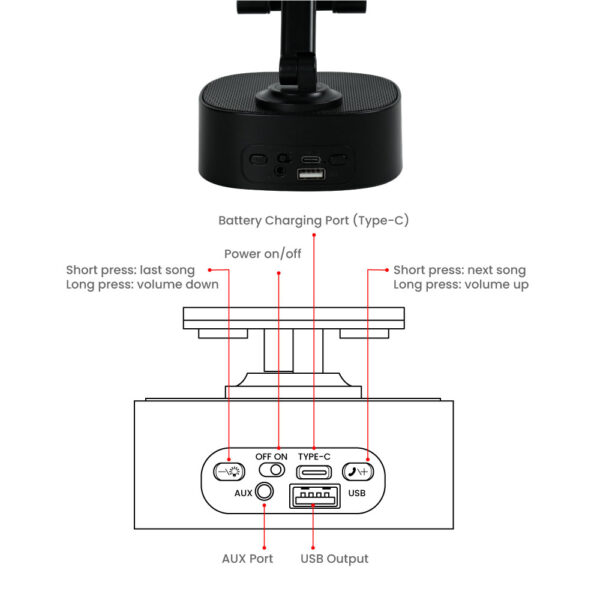 - Inside the box: (1) wireless charger speaker unit (1) Type-C Black Charging cable (1) user manual